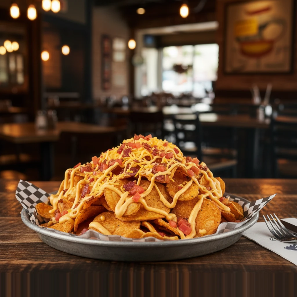 Seasoned kettle chips topped with bacon, beer cheese, cheddar, tomatoes, and chipotle ranch on the fords garage.