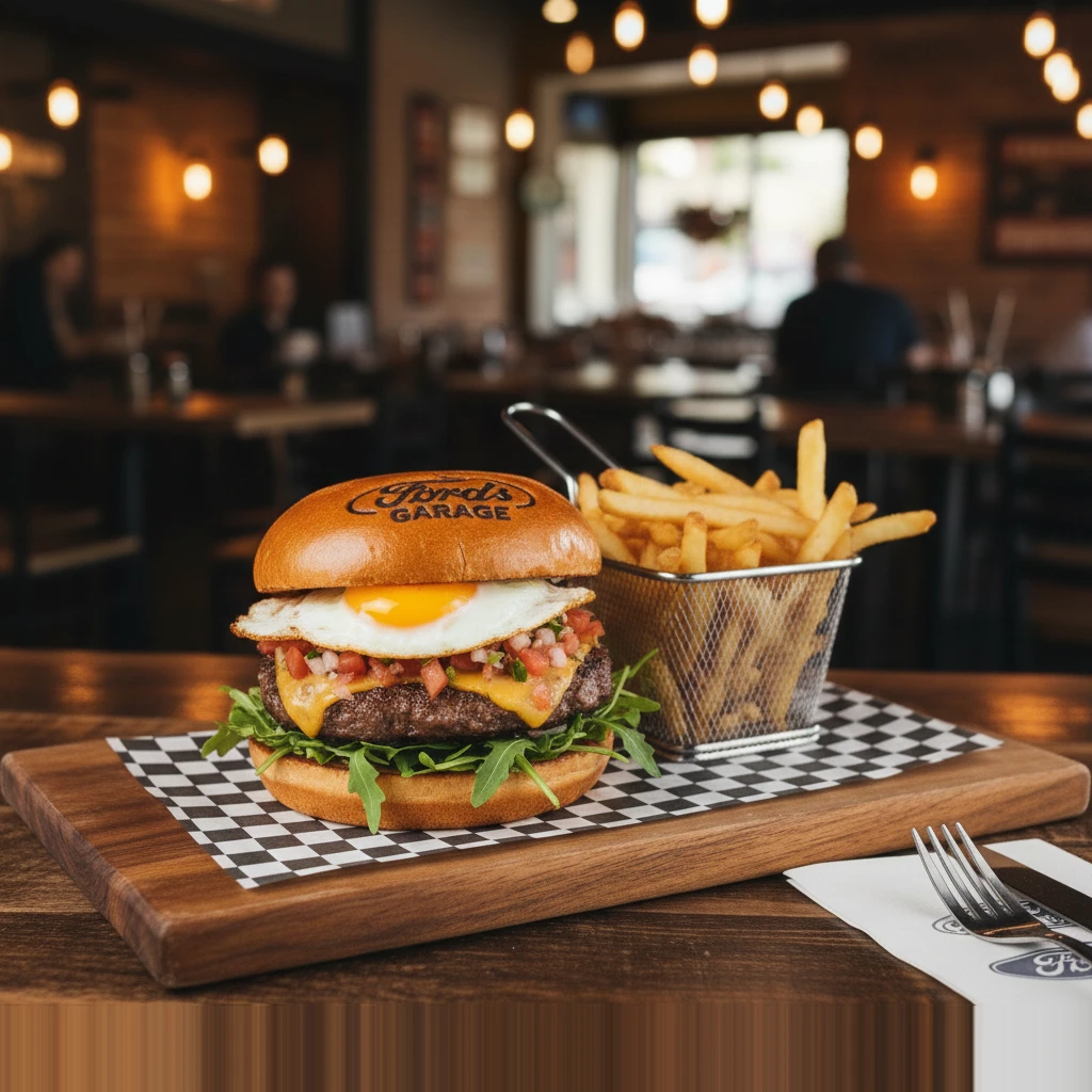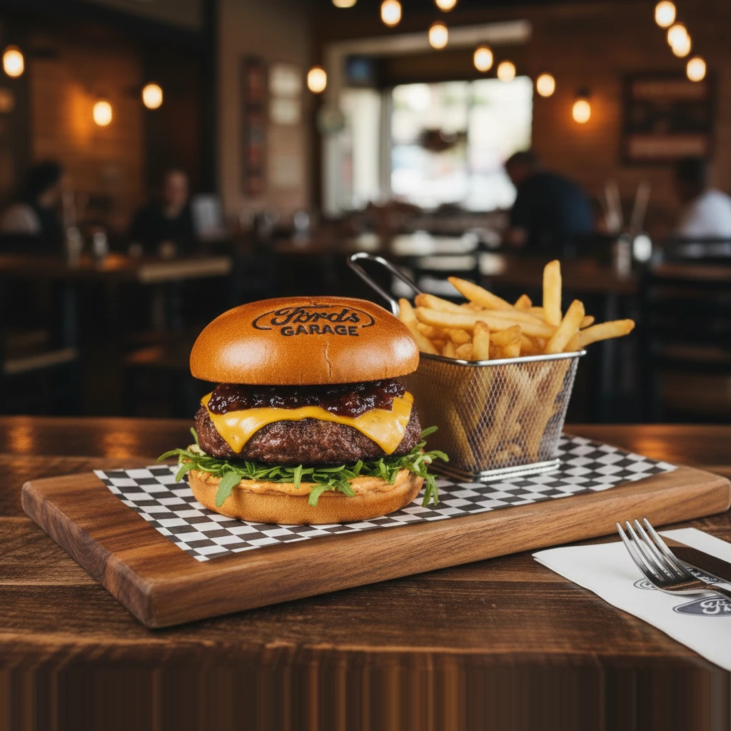 A premium bison patty with sharp cheddar, bacon jam, bourbon BBQ sauce, arugula, and chipotle aioli on the fords garage.