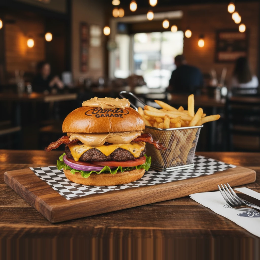 Sharp cheddar, bacon, bourbon BBQ sauce, lettuce, tomato, and red onion on a brioche bun from the fords garage.