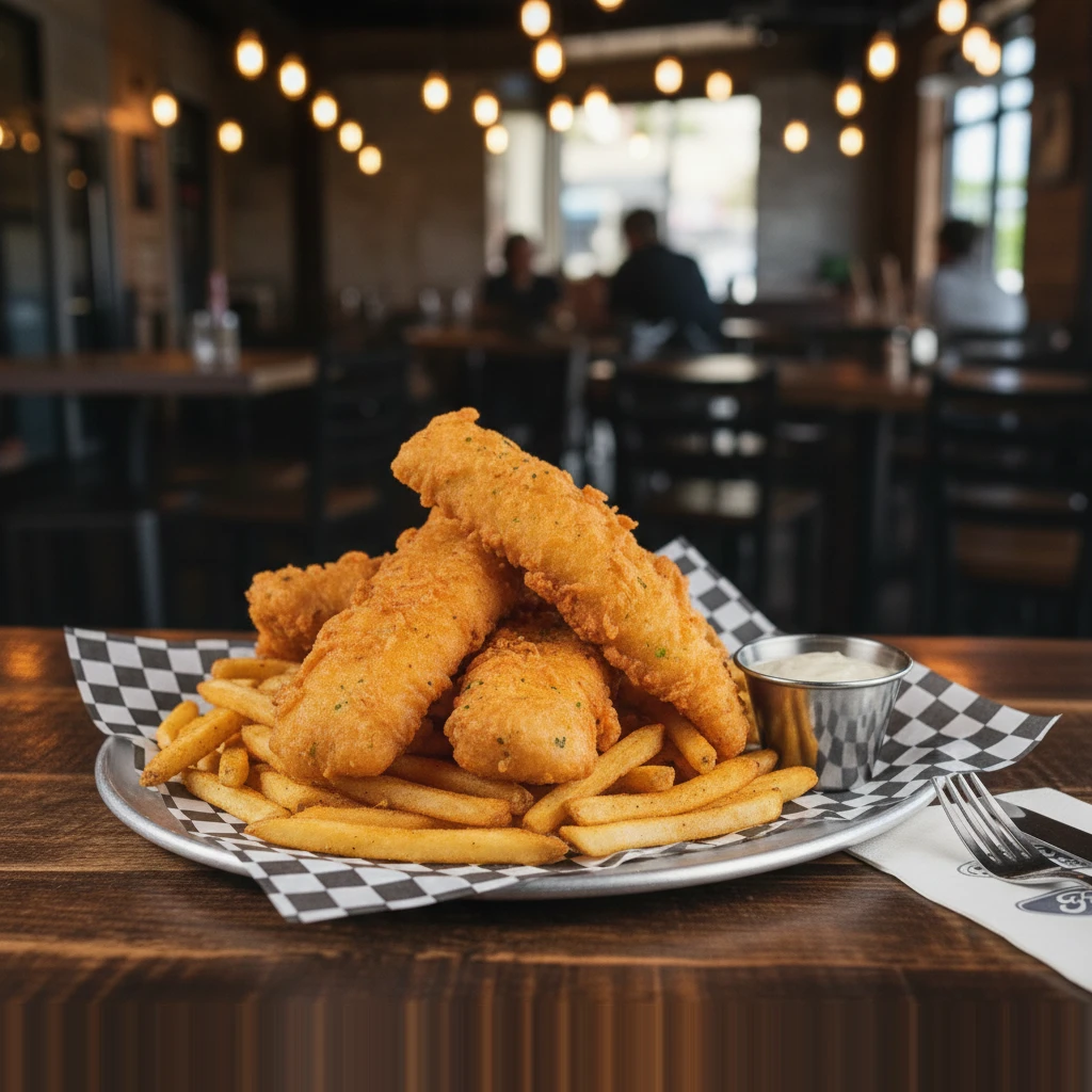 Crispy North Atlantic whitefish served with tartar sauce on a bed of seasoned fries from the fords garage menu.