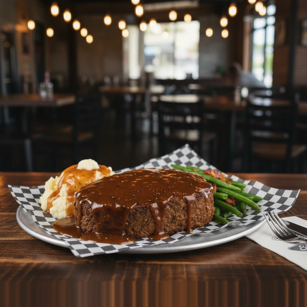 A signature recipe topped with house-made gravy and served with your choice of two sides on the fords garage menu.