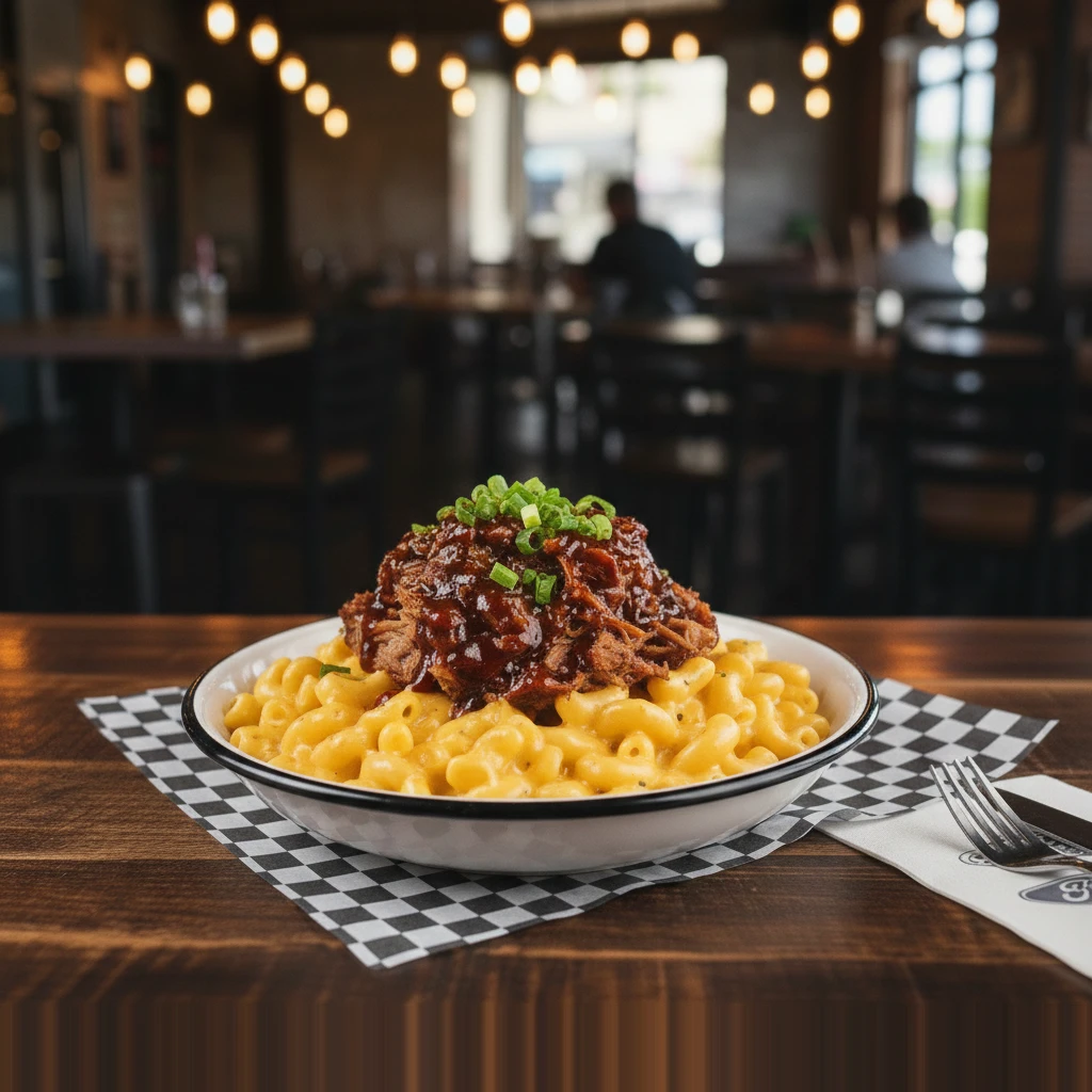 Bourbon BBQ pulled pork over cavatappi pasta smothered in Ford's Beer Cheese on the fords garage menu.