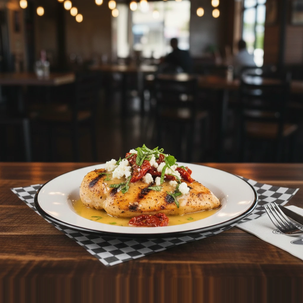 Grilled chicken topped with lemon butter sauce, goat cheese, basil, and sun-dried tomatoes from the fords garage menu.