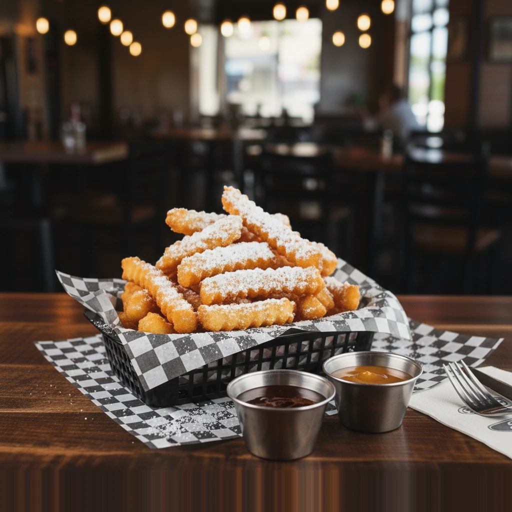 Sweet, fried dough dusted with powdered sugar and served with chocolate and caramel sauces on the fords garage menu.
