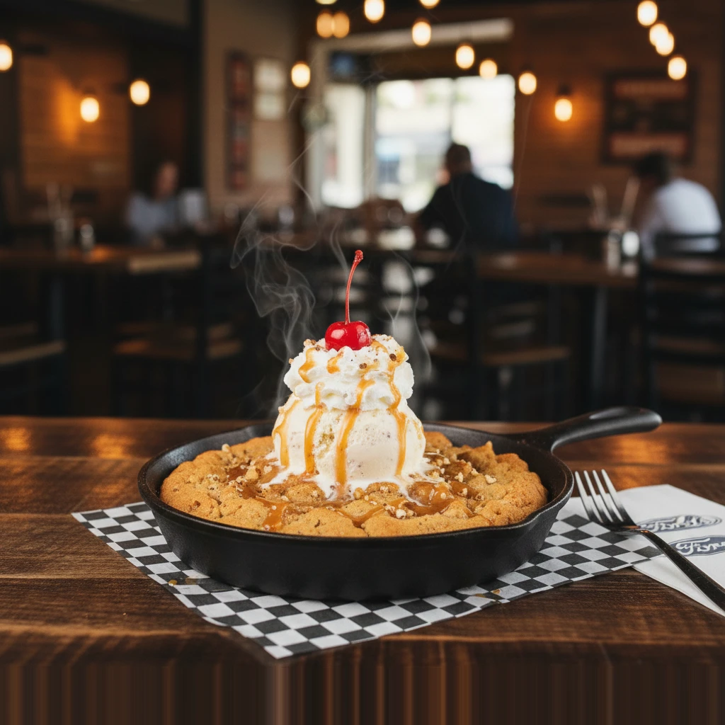 A warm caramel apple cookie topped with vanilla ice cream, caramel, and whipped cream from the fords garage menu.