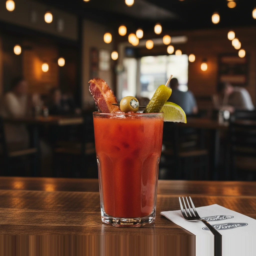 A loaded Bloody Mary with Tito's Vodka, a bacon slice, pickle spear, and a bleu cheese stuffed olive from the fords garage menu.