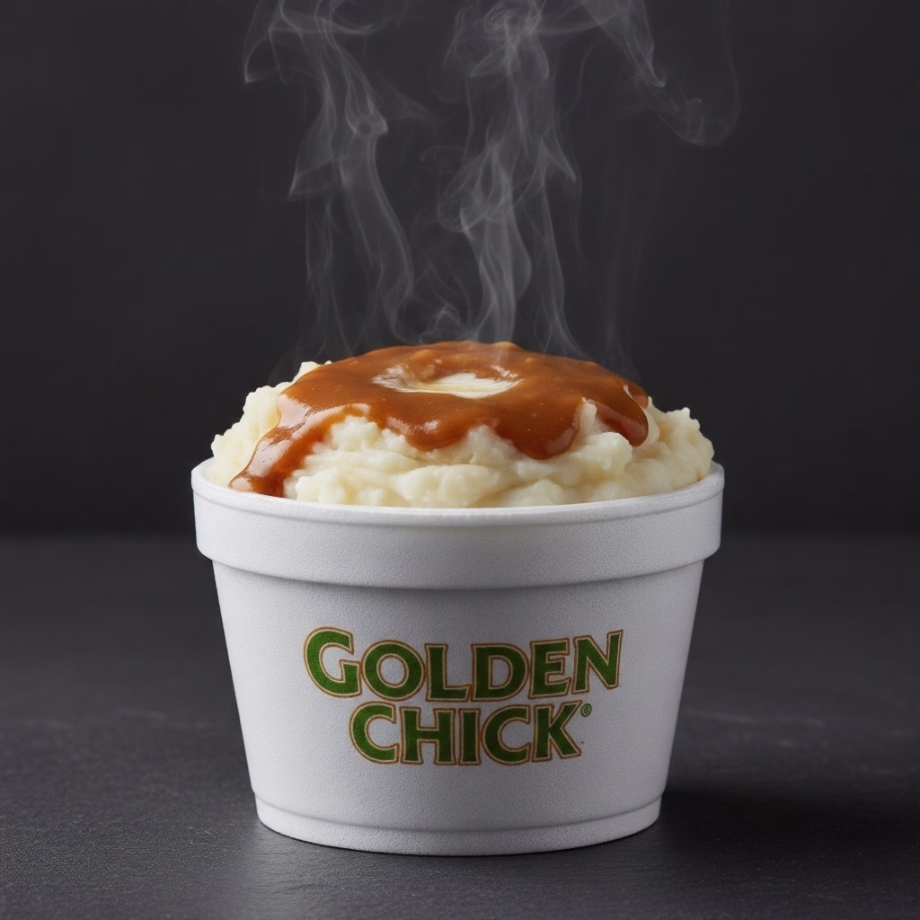 Creamy Mashed Potatoes, often served with gravy. A smooth, homestyle side on the golden chick menu.