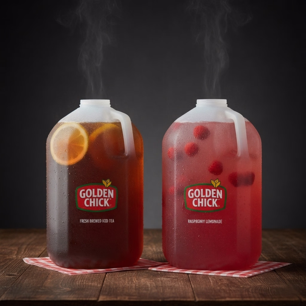 Large gallon jug of Tea or Raspberry Lemonade. Perfect for groups from the golden chick menu.