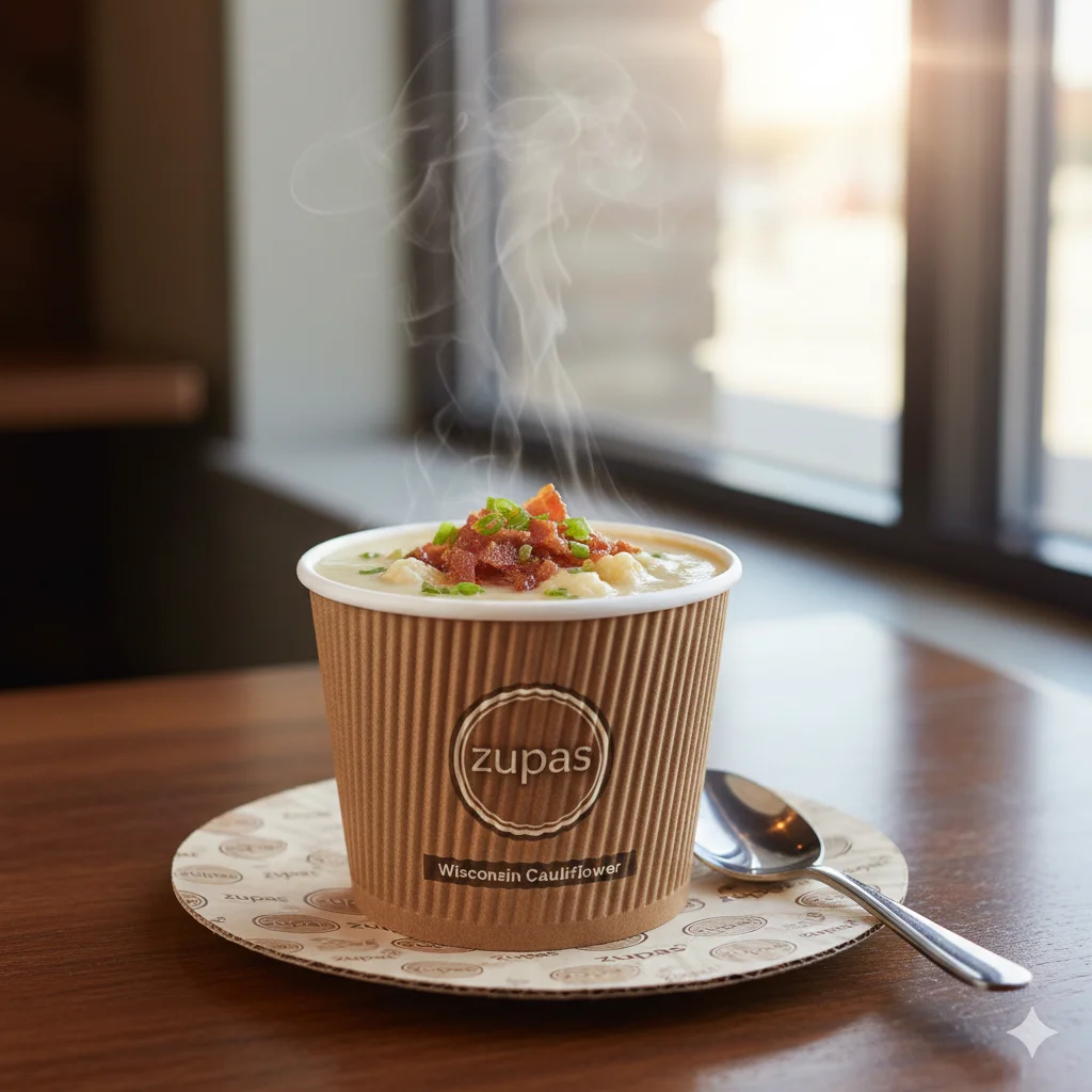 Creamy cheddar and cauliflower soup with bacon bits. A rich, popular choice on the zupas.