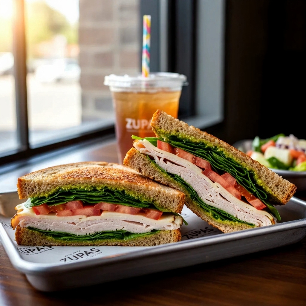 Sliced turkey, fresh spinach, tomatoes, and pesto on toasted bread. A lighter, fresh option on the zupas.