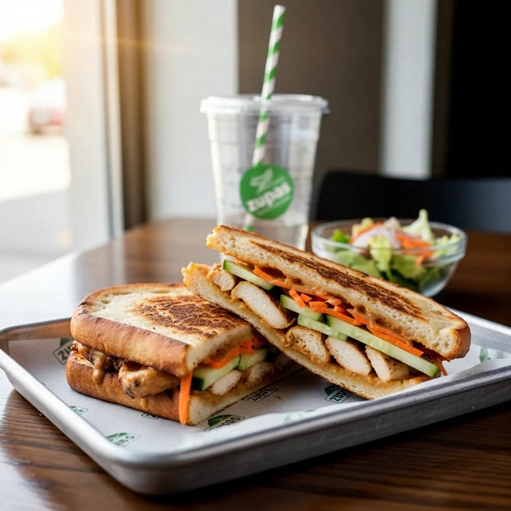 Grilled chicken, peanut sauce, carrots, and cucumber (in a wrap/panini). A unique Asian-inspired choice from the zupas menu.