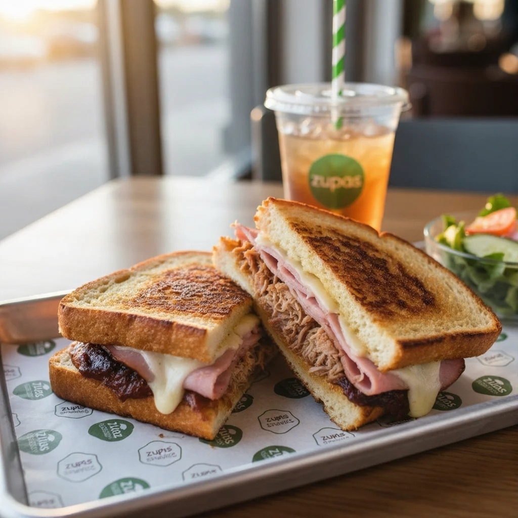 BBQ pulled pork, ham, Swiss cheese, and pickle relish on grilled focaccia. A hearty, pressed sandwich on the zupas menu.