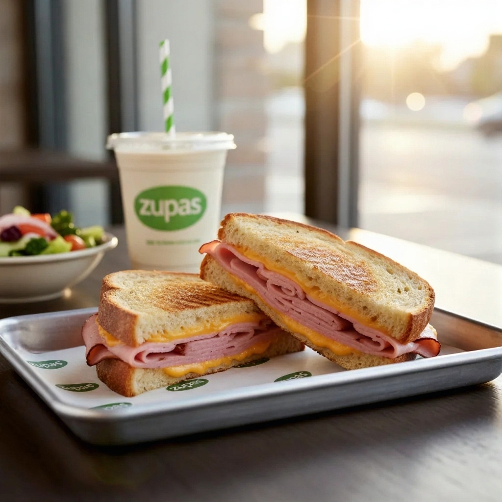 Classic ham and melted cheddar cheese on toasted artisan bread. A simple, comforting standard on the zupas menu.