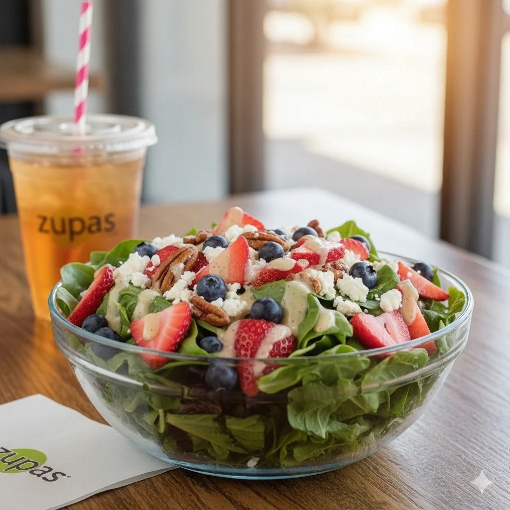 Mixed greens, candied pecans, fresh berries, feta cheese, and poppyseed dressing. A sweet and crunchy favorite on the zupas menu.