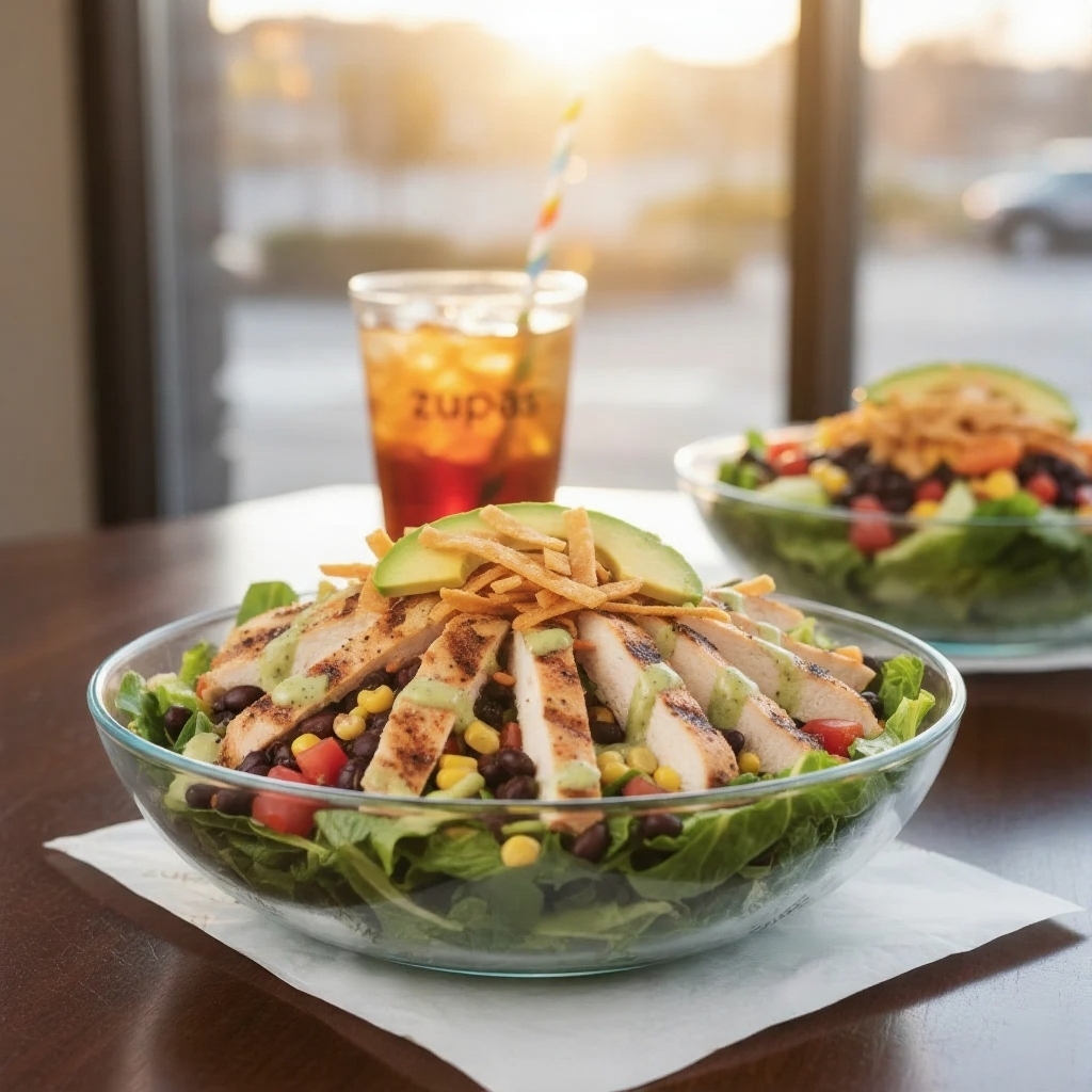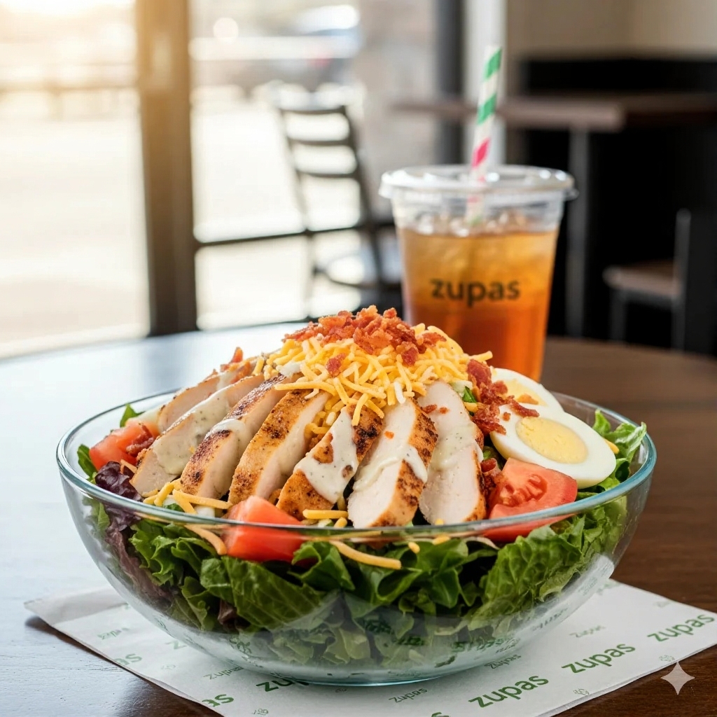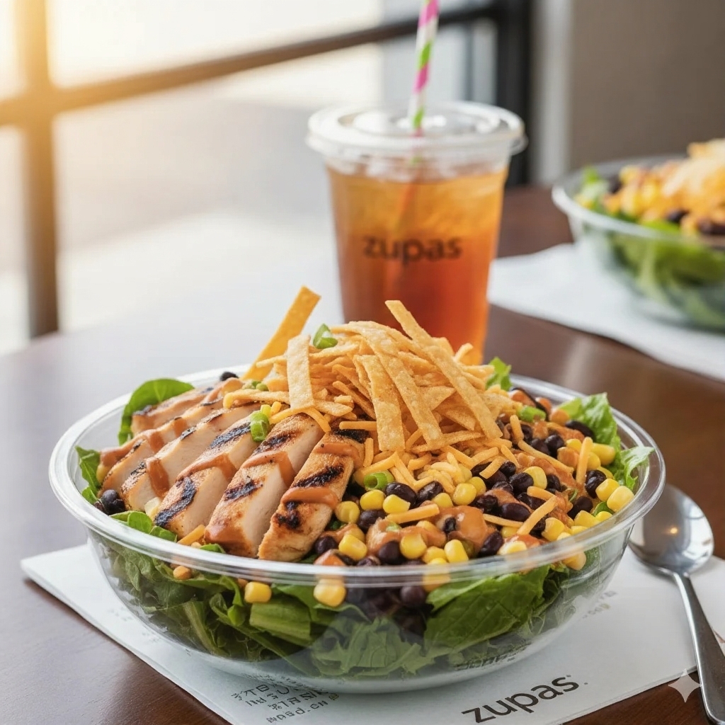 Grilled chicken, corn, black beans, cheddar, tortilla strips, and BBQ ranch dressing. A smoky, zesty option from the zupas menu.