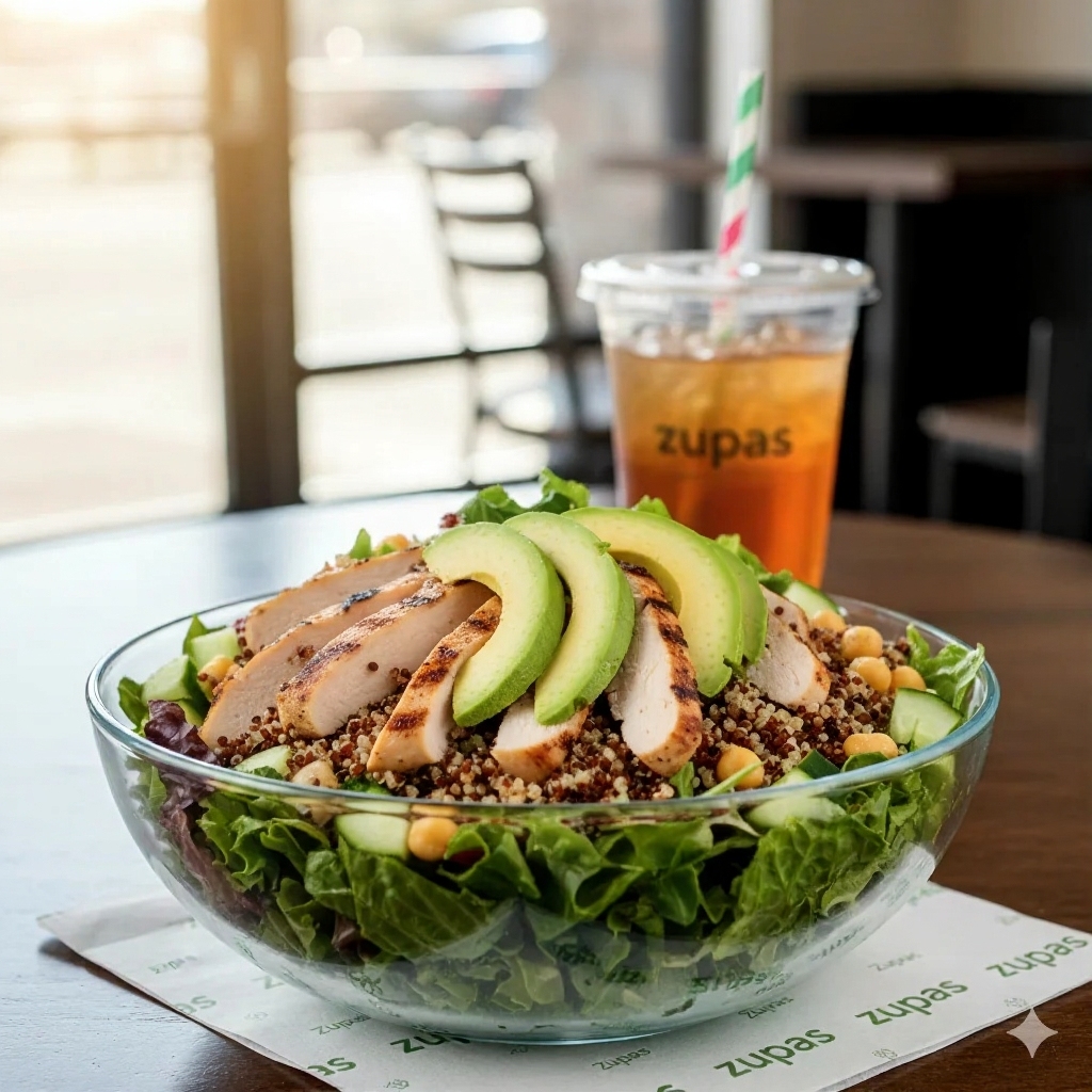 Quinoa, grilled chicken, avocado, cucumbers, chickpeas, and lemon vinaigrette. A highly nutritious choice from the zupas menu.